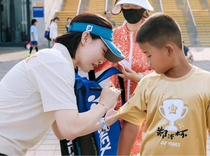 郑洁为干预“郑洁杯”青少年网球巡回赛的小球员签名。